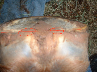 Posted on Thursday, Dec 18, 2003 - 10:07 pm: I didn't intend to advocate the foot in the URL I linked to as healthy or desirable. In fact I thought it was evident that the website is showing unhealthy feet advocating their trim methods. I also didn't intend to promote that particular website or the information it contains. I was just looking for a photograph with similar angles to Aileen's photo to illistrate correctly trimmed heels IMO ie. heels the same length or longer than the heel bulbs. Sorry for the mis-communication.I did some doodling on Aileen's photograph to illustrate my area of concern. A conclusion can't be made from the photo, but it is possible the horse is putting considerable weight on the bulbs of the heel. If a ruler can be place across the heels and touch both at the same time there is no problem. Otherwise I would consider the heels too short. Good day, Alden }