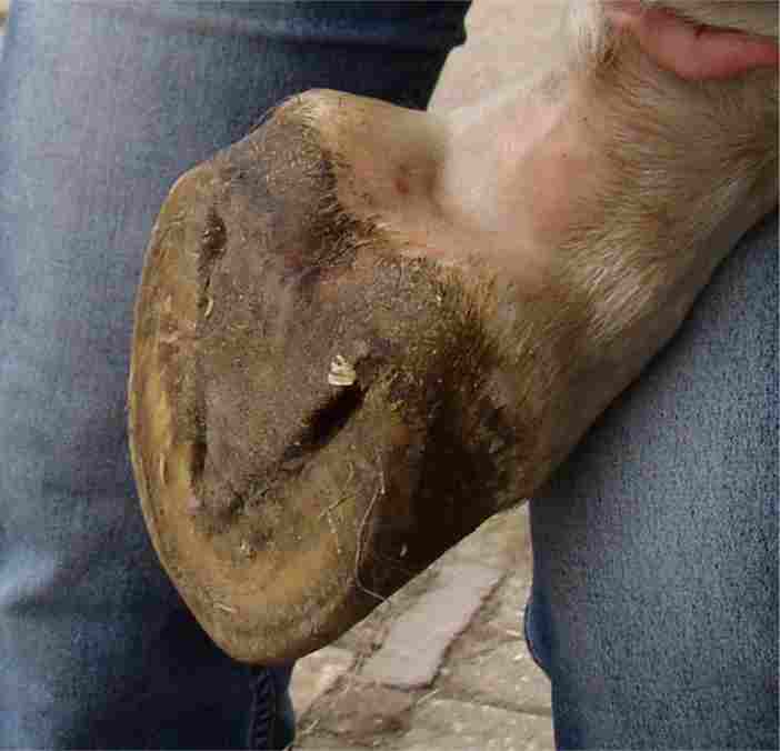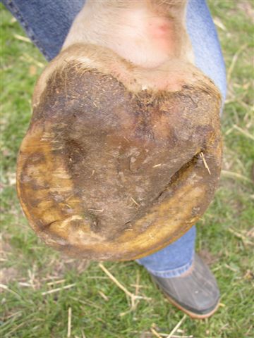 Posted on Sunday, Apr 18, 2004 - 9:50 am: The picture you posted above Nathalie (post 21) does show a sole that sticks out beyond the hoof wall. This is not a sole problem however, this is a wall problem and poses the question: why are the walls not growing out past the sole. There are two possible answers:1) They are being nipped back too far or 2) They are breaking/wearing off before they grow out sufficiently. Since the feet are tender (and I am assuming this is the cause of the lameness, this should be verified) the horse needs protection from concussion on hard ground until the walls can be grown out for more on promoting good quality horn see, Equine Diseases » Lameness » Diseases of the Hoof » Poor Horn Quality: problems with the wall and soles. I would treat like a horse with sole bruises see, Equine Diseases » Lameness » Diseases of the Hoof » Hoof Abscesses, Bruises, and Gravels. In response to those above who think the large frog is indicitive of a problem I disagree: note how wide open the heels and frog are. This shows good weight bearing not something you would see with chronic heel lameness. I have more problems with horses with thin contracted heels than those with big healthy frogs like that above. The pictures of wild horse feet that I have seen have frogs like that. If this is the area causing sensitivity, it is secondary to the wall problem. DrO |