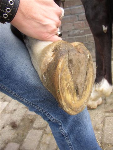 Posted on Friday, Apr 16, 2004 - 1:09 pm: I had taken some other pictures already yesterday. Maybe they give you a better impression. The frog seems to be longer now as the wall of his foot is. It almost seems like most if his frog is "lost" in his sole. Both the wall as the sole seem to be touching the ground when walking. I hope to have the farrier out next week. Might shoes help to have his feet grow without them wearing down more or will they do more damage?No the sole is not very soft (under finger pressure for example). When I lead him from his stall over concrete to the pasture he seems to be very tender. (but then again, not when you test them with a hammer or something else).