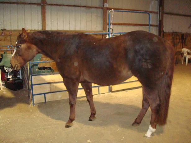 Posted on Monday, Jan 14, 2008 - 4:55 pm: Quick update: so far, Rockin has lost about 30-40 lbs! She's consistently weight taping at about 1018, and I'm hoping when this latest cold spell is gone, she'll DrOp some more. She really seems to hang on to those pounds when it's in the -20's and 30's (sorry, not sure what the conversion is on those temps - let's just say, freezing cold!)She's still off with the lameness, but I'm not expecting much improvement for at least a month. Oh well, she doesn't need to work anymore! She also, surprisingly for me, seems really happy on her own! She can see the studs from one end of the arena, and the herd that she used to be out with on the other. She chooses the stud side most of the day and really just relaxes. The only thing she seems lonely for at all is food! I've started her on some human senior multivitamins as per Dr. O's suggestion, although I'm not giving as much at first (since I'm pretty sure the hay that she's getting is good quality), but she was really going crazy for her mineral block, so I figured it would be beneficial. I'll update again when some more change happens, and when I have some updated photos that actually look different. I'll try to get them up while she's skinny AND hairy! Thanks again for all the support. |