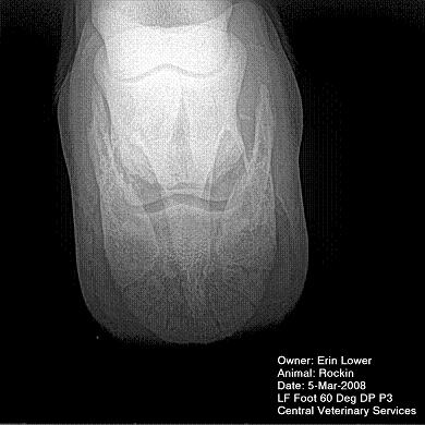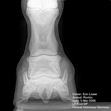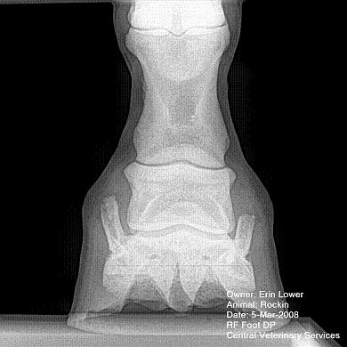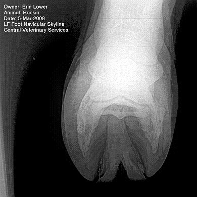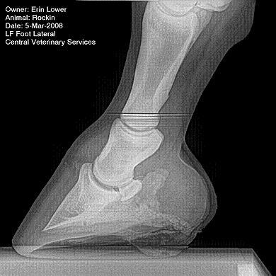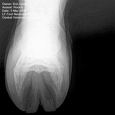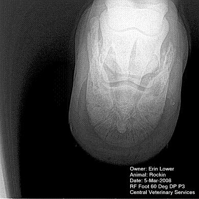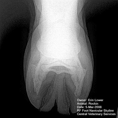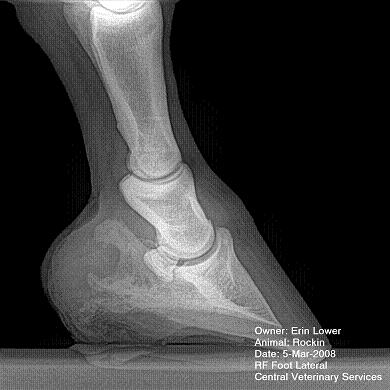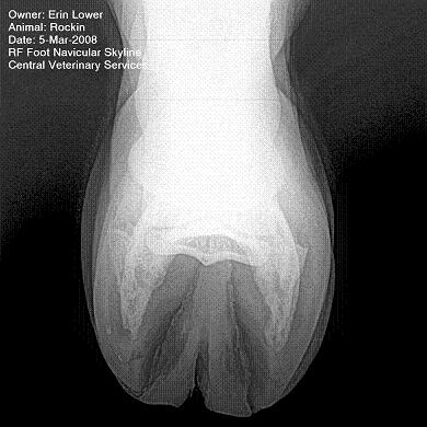 Posted on Sunday, Apr 27, 2008 - 10:13 pm: Hello to all! I'm back again much sooner than expected (I asked for this for my birthday).So, Rockin's x-rays were sent to a radiologist and he confirmed "normal" changes in the navicular bones for a horse her age, but slightly more significant ones in the right (sore) foot. She also has sidebone in both fronts, but apparently that isn't causing any discomfort. Finally, she has a "small chronic exostosis on the lateral aspect of the proximal phalanx" which, according to the radiologist, shouldn't be causing discomfort but I have read that these can be mild-to-moderately painful... I wouldn't mind another opinion on that. As for shoeing: eggbar shoes (1/8" thick) with 2 degree wedge pads. Since the shoes were put on, I have been able to ride her with minimal discomfort to her, and her behavior has changed dramatically. She is lively, sweet, and doesn't spook anymore! She is the horse that I knew when she was a mere 6 years old. The weight is staying off, mercifully, with still very little work as I want to move slowly. I will attach as many images as possible from her x-rays (there are many different views). I don't have any pics of the feet as someone deleted them from my camera before I could download them. I'll try to take pics next time she is trimmed. Please, anyone with knowledge of hooves, give any opinions that you might have (especially Dr. O!) Thanks all
