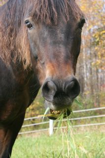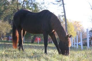 Posted on Tuesday, Oct 21, 2008 - 9:52 pm: Diets are so hard!! I feel like a dope. I know poor Dr. O always sending us dopes to the proper threads, but I'm still confused!!When I got her she was thin, a 4 maybe, her tailhead and backbone were prominent, but not bony but very out of condition. She was at that time I was told only on grass. She was thin though. Then she came to the barn where I was boarding with no pasture really, she got hay and Safechoice, it took a while for her to start looking better, now her coat is shiny and she's getting fat. Her rump is all filled out and she is getting a hay belly!!! Even her neck feels a bit cresty. But it happened quite fast, really just since she's been here, 2 weeks or so. the Cocosoya is definitely out, and I'm trimming down the Safechoice, and maybe less hay. AND some exercise might help too... I had to adjust her sheet, it had gotten tight just from last week! It could also be the grass hay, they hay she was getting was more stemmy and rough. Do I need to reduce hay too? I am giving them lots of hay since they are not out 24/7 on the pasture yet, so they have something in the paddock at night and for the time they are in there during the day. I really wasn't expecting her to swing the other way, I was actually concerned about her weight going in to winter, but she is a Morgan. I'll post a pic Thanks Adria |