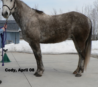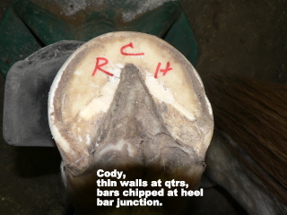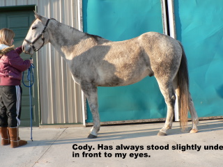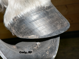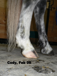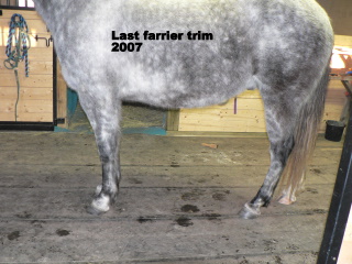 Posted on Wednesday, Nov 4, 2009 - 7:47 am: Diane,I'd like to see a tighter white line, more concavity, and a nice toe callous from more movement. I don't see anything that needs drastic fixing, maybe heels in hinds? I seem to have trouble with hind hoofs, and white or striped hoofs! (optical illusions ya know! )Just keep on tweaking him, and letting the hoof go where it's supposed to be. There is a bit a toe flare yet in fronts, you hopefully can see why in the upcoming pictures. I am adding a few pictures: Labeled, but in case you can't read them, the first Cody's last trim from a farrier early 2007. Compare to my full body shot above. Another full body shot showing him standing under, long toes in front, and I got the heels waaay to low in the hinds which took forever to grow back. I'll see about getting some pictures of Tango up, his hoofs were more like Hanks; he's still not where I want him. Advice to anyone attempting to learn how to trim your horses yourself: DO NOT TAKE ON MORE THAN ONE HORSE THE WHILE YOU LEARN HOW TO TRIM!!! Yes, I am yelling that out loud & clear! ![]() ![]()