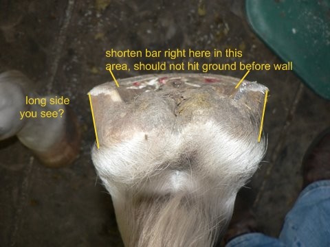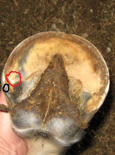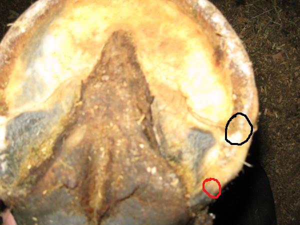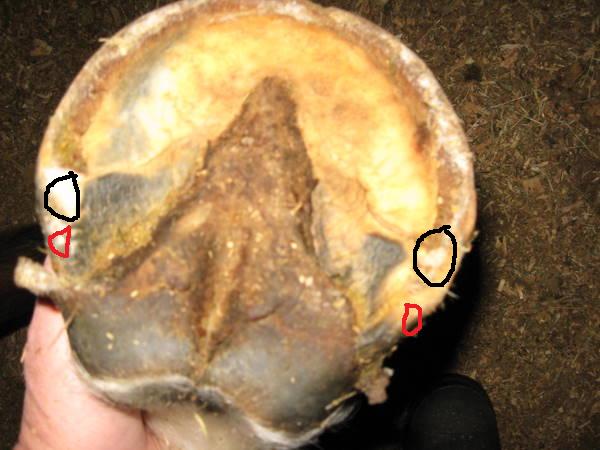 Posted on Thursday, Dec 17, 2009 - 8:20 am: I took some pics of Hanks hoof in the dark to show the toe callous which didn't show up because of the flash I guess. They are not the good shots for Dr.O. either, BUT they are showing what confuses me ....what exactly is considered the heel point and how do you tell they are under run for sure???The black circle represents where the bar meet the wall, the red circle is where his hoof wall ends which is it?? Thanks! Closer up Without circles...incase someone else would like to draw to help me understand