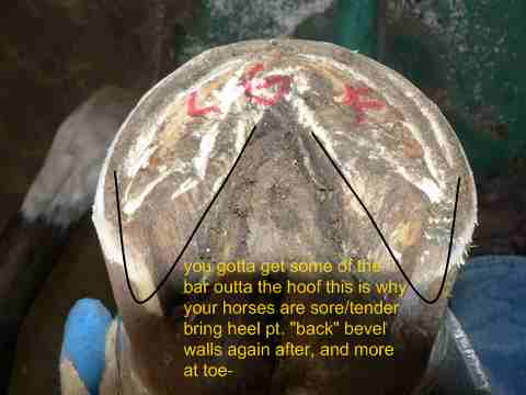 Posted on Friday, Dec 18, 2009 - 7:20 am: Just thought of a precaution here. Make sure you do not lower heels. There is a difference between what I am describing, bringing the heel point back, and lowering the heels. Keep the rasp flat.Something else to check, if you lay the rasp across at his heels, is his frog higher or lower than the walls? It looks like a good healthy frog. Hopefully his walls are not lower than the frog? BTW, I meant 30 degrees, not 60 on the bevel...again, pictures would be best to show what I do, I HATE thinking numbers, I like to just go by what LOOKS correct instead of remembering numbers, and formulas, etc. If I can get someone to hold the camera this weekend, I'll try to get some pictures for you showing some things. One thing I never could find when I was starting out was those little details like how to hold the rasp, and the knife. Before and afters are great, but what you do to get to "after" is the most important. Glad you are hearing bells, lol! |