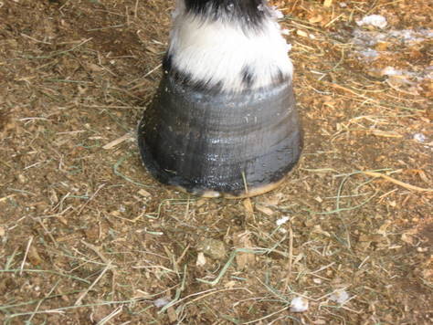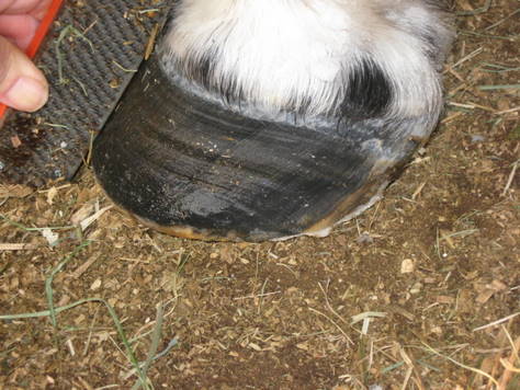 Posted on Tuesday, Dec 29, 2009 - 8:34 pm: I don't know Lori it appears to have gotten bigger and has gone HIGHER up his hoof wall, so don't think gravity/growth is at work with it. He does have them on his back hooves too at about the same spot, so going barefoot theory is out! I'm trying to think if anything changed in their diet/environment at that time...but am drawing a blank. Angie I am not done with Hanks hoof I see at least a part 10 with me trimming him...before I get everything straight! If anyone can get Hank to a "perfect hoof" HA can! But Gawd what a long haul