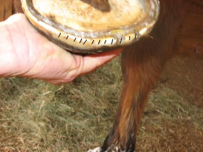 Posted on Friday, Jan 1, 2010 - 8:25 am: Rachelle I don't think so it seems too high in the hoof growth, the clover was killed about 6 mos. ago.The mare was mostly in the back yard at the time because of her bowed tendon and wasn't exposed to it much. Knowing their hoof growth rates I would guess it was something within the last 2-3 mos. Maybe it is just normal