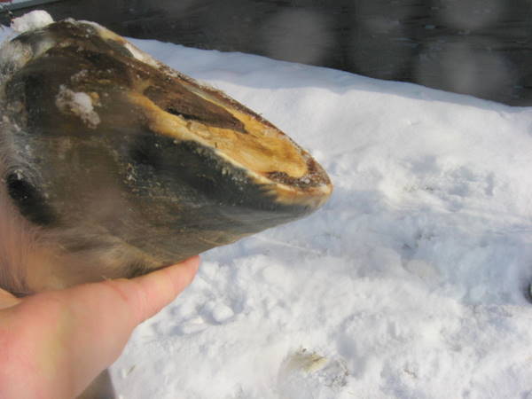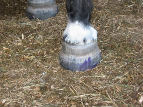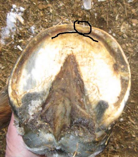 Posted on Monday, Dec 28, 2009 - 7:03 am: All pictures are left front, unless specified otherwise.I understand what you guys are saying but I am not sure at this point it would be wise to do. I need to look at his hoof again. In this pic I put a line around his toe callous, and a circle around a "blob" on his wall. I believe this is from his pawing through the snow (which is very good exercise for him!) His WL is not as stretched as in the picture Racelle and Angie painted on. His wall is even with the sole at the toe. Julie I think you may be right, maybe Dr.O. will chime in with his opinion.