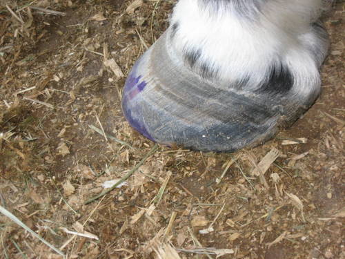 Posted on Tuesday, Dec 29, 2009 - 12:15 pm: Diane, just wondering, if the discoloration is a bruise dons't it make sense that it would travel down as the hoof grows?Maybe it has changed to quickly for that. |