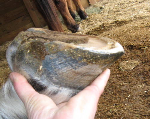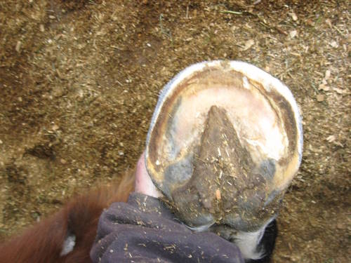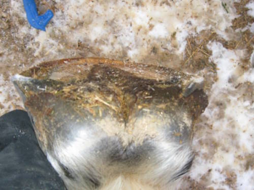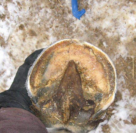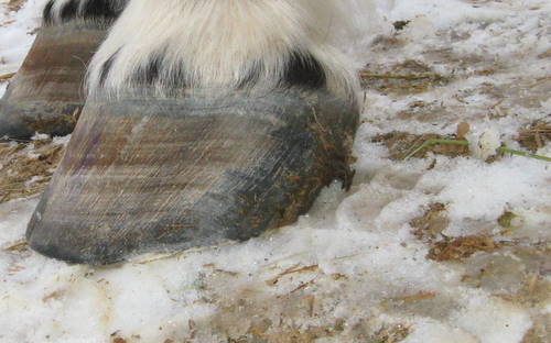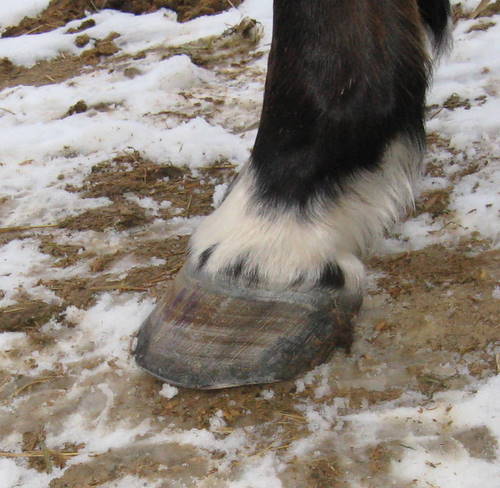 Posted on Thursday, Feb 25, 2010 - 7:12 am: Boots are not a solution for Hank, unless there are some here that will fit him, I WILL not buy anymore as I said before his hoof changes too much and I have way too much money stuck in boots that don't fit already. I will not put them on him for turnout either they turned his hoof to mush last time I had to use them, he got terrible thrush and WLD.The farrier coming does scare me a bit, I am going to have him be fairly conservative with Hank and Sam..the snow storm missed us and we got the very cold weather back with the peaked hard ground, Hank and Sam seem to be doing pretty good on it right now. I actually saw the mare tippy toe for the first time yesterday...her hoof walls are really long now tho. Hopefully he can get them all going in the right direction without soring them up and I can maintain them. I have gotten a start on Hanks RF and it is coming a long. AND guys I think we are going to make it through the winter (that has been quite hard and peaked) without any severe, crippling bruising) this really is a first for Hank in years, and why he ends up in shoes in the spring.... that is why the farrier visit is making me nervous! He is coming at 4 this afternoon if I can get pics before dark I will...keep hooves crossed Hank (and Sam) don't get sore