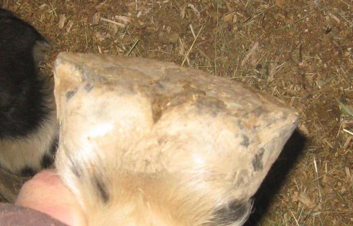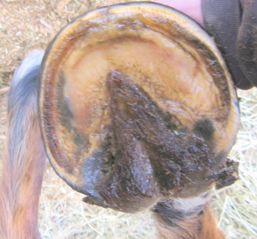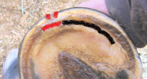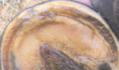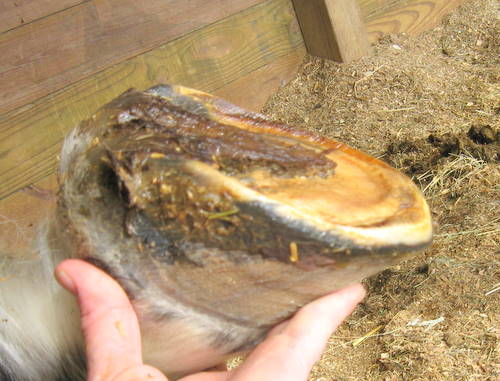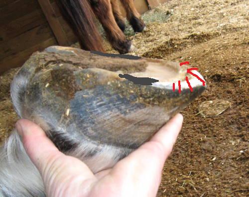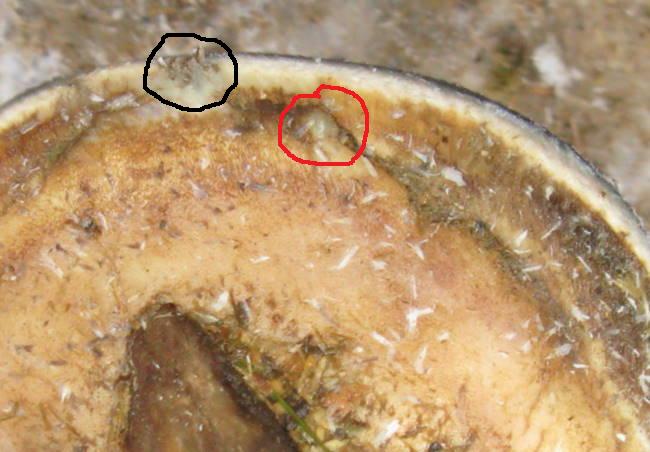 Posted on Saturday, Feb 20, 2010 - 9:39 pm: Vicki I have read everything on the web, I can't even remember it all Yes I have read that site a million times... and counting! Well I guess it's good you can't tell it was quite obvious in my earlier pics One more pic, I was looking at Hanks hoof trying to make a plan. BOY that toe on his LF has a lot going on! I zoomed in on the blob and something else I saw and what a mess. This mess has been covered by his long toe, no wonder he has been lame forever... but what to do and what the heck is this new pearl on his sole, there is so much congestion there between the "old" blob the cracks, the toe callous ect. Black circle old blob Red circle new blob????