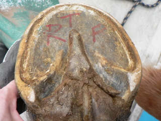 Posted on Sunday, Feb 21, 2010 - 8:11 pm: Rachelle,You were posting Tango's pic with the yellow lines as I was posting what I did today. He moved off fine, but I'll print what you are saying above to study. Thank you! Vicki, sorry about the shadow! I took pictures of 3 of the 4 horses hoofs today and every hoof got a little touched up at the very least. Pictures are a pain in the barn, poor lighting, cold, marker isn't writing, and I can't see what I am getting through the camera lens half the time! 'Nways, I took off frog at the back because it was a mess. Loose flaps, holes, ugh. It is lower than it should be. I meant to put some of Ramey's thrush med in there, and forgot to. I am not sure why it's all chewed up, but I felt I had to clean it up. I HATE cutting on the frog at all, don't seem right to me. |