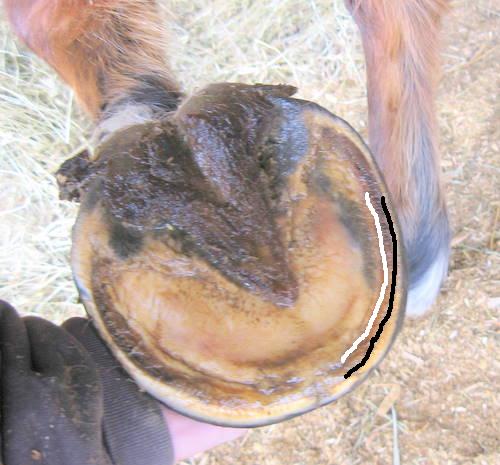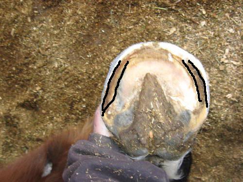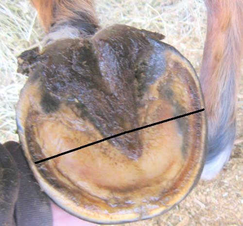 Posted on Sunday, Feb 21, 2010 - 6:02 pm: Rachelle I don't think I even want him to touch the LF..but maybe he could help me get the RF caught up I know it appears he has a lot of hoof wall on LF but he doesn't!!! That's why I decided not to touch it. Anna in Hanks pics it is hard to tell where everything is White line... is his white/yellow line Which I was really surprised how much tighter it looked after a good hoof scrubbing...matter of fact I was shocked! I'm so glad I did that Rachelle! I have never seen his WL that narrow in YEARS! Maybe I am wrong. Black line is the water line.. I think, correct me if I'm wrong. Scroll up to see the same pic without lines on it. I copied this from the barefoot website