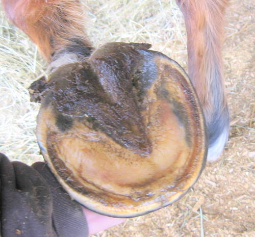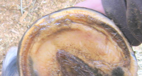 Posted on Tuesday, Feb 23, 2010 - 12:18 am: Well what a mess huh?? The farrier is coming Thurs. to do the other horses, I'll see what he thinks. I'm sure he'll have no idea. I have only been doing Hanks hoof from the bottom, his toe appears to be coming back..especially if you compare it to the right.. so do you need to do anything from the top?? That's where the farrier always rasps after he nips off the hoof wall and the results haven't been that great. |