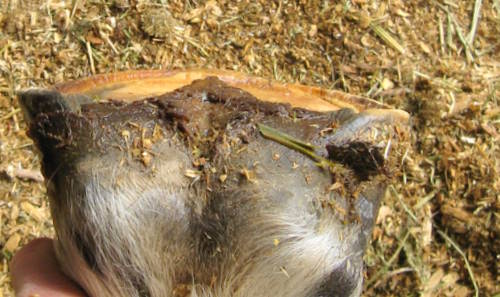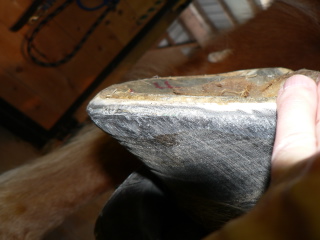 Posted on Sunday, Feb 21, 2010 - 8:28 am: Rachelle I don't think a wire brush would clean that out.. however what is black IS the stretched WL So you can see how stretched they are by the black areas. Same with Tangos above..his isn't near as bad as Hanks. As a rule tho that black area IS stretched WL. This IS all stretched unhealthy WL... flare, his toe is getting much better... still have to get rid of the rest! That is why his walls appear higher in the pics than they really are on the side that are flared..the left side isn't near as bad as his right.