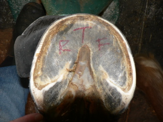 Posted on Sunday, Feb 21, 2010 - 5:31 pm: Diane,What a difference! Left front looks really good, bet you could rocker it a bit more to get it like it was a few weeks back. The RF definitely needs work. You can see the flare all the way around the foot. It has to be uncomfortable for him even though he is not showing it a lot. You can see the hoof wants to grow the right way, but all that flare needs to leave. If you work on it slowly like you did the other one, you should be ok. I know you said you want to have your farrier out to help you. So I have a suggestion. Mark everyone's feet as to where you want him to rasp and tell him not to get carried away! Like they do in a hospital so they don't cut off the wrong leg! Rachelle |