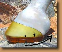Posted on Sunday, Mar 21, 2010 - 2:51 pm: Diane,Where you have your dots is almost exactly where I set the screws. Part of the problem was that we only had three screws per foot to deal with. I would have liked 5 and because the boot unless you do glue it on, is not an exact fit,there tends to be a gap on the bottom that adds to the tortion when the foot hits the ground. I think I did the right thing by gluing on the colts boots, today he was bucking and kicking and playing on the gate and the boots stayed on, and because the heels are not glued I can wash any track garbage out of them easily. I think the more I think about it the more I like the velcro idea, my trimmer is waiting with baited breath (not) to hear about my next experiment. Rachelle |