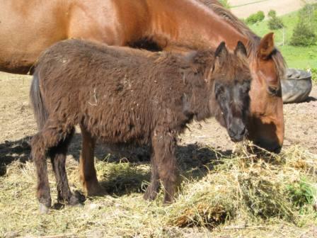 Posted on Friday, Apr 23, 2010 - 9:42 am: Attached please find a photo of our newest herdmate, Peggy Sue. I promise she is not a baby buffalo. She was born last July, the the accidental result of a standard donkey mating with a mini mare. I bought her from a petting zoo owner, who in my estimation ran the equivalent of a critter mill--lots of different animals, shoddy facility, questionable feed. Assuming there's really a mule underneath, I'd like to know how to feed her. Our other horses have mostly shed out, but Peggy Sue is really hanging onto her long locks. Her previous owner says she never got a chance to shed her baby coat before growing her winter coat. As of now, very little comes off with brushing. The vet came out yesterday and guessed poor nutrition may be contributing to the slow shed out. He vaccinated her and suggested worming her again in a few months, since her previous owner wormed her just before I took her home three weeks ago. I asked about graining, and the vet wasn't so sure. I'm not either, given her size and pony heritage, but I always thought the young ones needed the extra nutrients. Could I maybe supplement our good hay with vitamins? Her dam was likely fed nothing more than grass hay and so I want to do what I can to make up for whatever she might have missed out on.