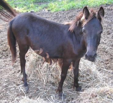 Posted on Sunday, Apr 25, 2010 - 5:02 pm: If she's less than two, the big belly may be due to a worm load and/or sand. Unless you have clean fecals from your vet (can't tell by looking--you need a microscope), she should be wormed as per Dr. O's formula for worming debilitated horses and then every thirty days until she's one year, again, unless you have clean fecals. If you don't want to run fecal tests, given her age and poor background, I think you need to be following a more agressive worming program--again, Dr. O's article. Wormers aren't always completely effective in youngsters and they harbot LOTS of parasites. If she is thin (unusual for mini anythings!) your best bet is to get her on free choice grass hay and then add a pelleted feed formulated for foals. If she's handling your hay fine, increase it gradually. If you're unsure about grain, I'd just add a pelleted ration balancer that adds vitamins and minerals and you feed a very small amount. Probably a cup a day for her size. I've brought a number of weanlings in poor condition to slick and shiney with this basic care. I doubt you can tell much from her "energy level" especially based on a one time view. She also may have a belly full of sand if she's been on sandy ground. Even well fed babies will eat and lick the ground. Introduce the product for clearing sand by leaving a few pellets at a time in the bottom of her feeder among the alfalfa leaves. Increase daily as she accepts them until she's getting the recommended dose. In my experience, sand in the gut will make them hold onto the haircoat as well as appear to have a pot belly. Of course, keep her off a sandy enviornment. |