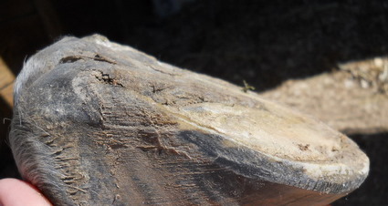 Posted on Wednesday, Sep 29, 2010 - 4:29 pm: Angie that is what I did I put a VERY strong bevel/roll at the boys toes, I could have done even more, but dang that's hard work! I figured if I stay at them over the next week or 2 I could get them close to where should be without soring them up. I don't know how to deal with the quarters on Hank, over the last month or so his hoof wall has completely peeled off there and his lamanaie are hanging out . I wasn't sure how to deal with that because there is nothing to bevel! This I believe was caused by the farrier rasping from the top and the wet weather we had. I cleaned it up to the best of my ability. I started Hank and Sam on Nu-Hoof Maximizer last month, I have had good luck with that before and the ingredients seemed good. Their hoof walls seem weak, hopefully caused by the weather.