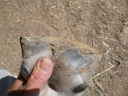 Posted on Sunday, Oct 17, 2010 - 11:15 am: Angie, quite dry here and that has helped tremendously. Haven't took pics of the pretty hooves for awhile so just ran the riders rasp around and snapped some. I think you're right Hanks hoof is looking pretty good his heel points have really come back, the flares have mostly disappeared, his frog is relatively straight and the EVIL blob is gone . The bars look OK.... and he is sound, the most important part! He has developed a more normal looking toe callous also. What a long very productive year!!! We made it without shoes for the riding season, I only used boots for a couple weeks. Hopefully this winter will prove a little easier for him. Thank you Angie, Rachelle and everyone else who helped me get a serviceable hoof back! Not perfect, but remember where we started!!! 13 parts earlier!