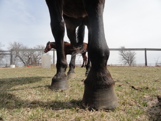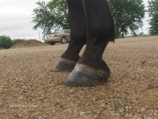 Posted on Thursday, Apr 7, 2011 - 10:14 pm: We have been posting on this sight about poor levi's feet since i think 2003 or 4 or something. He has had rotation, according to the final vet we visited, from having a short ddt, and a poor trim, that caused the rotation. He could also be an insulin resistant horse, but that is yet to be determined, he eats constantly.I normally trim every 5 to 6 weeks, but we went way too long. this time. I am going to try to post new pics, they are on grass however, so don't know if you will be able to see much. He has to be upright due to his still existing rotation. If he gets a long toe, and short heal, he is lame. I will try to post pics, they look way better and he so far is sound. We will have to see what tomorrow brings, that is usually when we have trouble.
