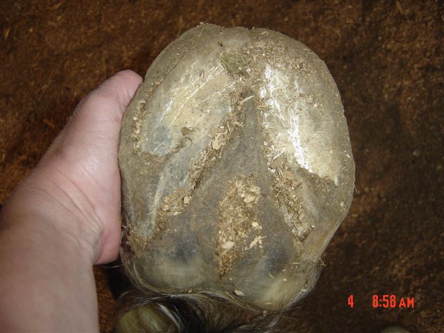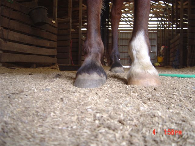 Posted on Tuesday, Mar 6, 2007 - 6:33 pm: Hello katrina,The problem with the images running off to the right is you did not put a blank line between them. I have edited the posts so they don't push it off to the right. Much of the standing view above is lost in the soft material the horse is standing on. This needs to be a hard surface. Also taking the shot from directly in front of the horse when the feet turn out a bit makes it difficult to judge m-l balance. You need to take one shot for each foot and leg standing directly in front of the leg and the way it is pointing. To evaluate the a-p balance we need a shot taken from the side with the horse standing square. Often each side needs to be shot separately. katrina, almost no matter how good your photos are, you are going to be able to get a better evaluation of the foot by being able to view it from different angles and different lights and by watching the horse move and see how the foot lands. While we are glad to evaluate what we see on the photos you need to understand the principles of balance and the last decision always rest with you. A few thoughts on the comments about. A wall that flares quickly is often because that side is a bit longer than it should be for balance. Cutting the heels short does not cause underrun heels, it is leaving them too long that causes the tubules to bend so the distal aspect points forward. DrO |