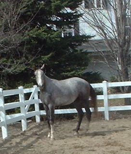 Posted on Sunday, Jul 8, 2007 - 9:18 am: Oh yes, every one and his spine is prominent too, also his neck. I will attach a picture though he is grey and wet so I am not sure that you can see from the picture. He also ran around last night a lot more than normal (he has night turnout). It was raining a lot and the road that their paddock is on was noisy and they had some scary hay equipment going across the road. Well this morning when I took the pictures I thought his pastern angle was much improved, maybe I am just seeing things...