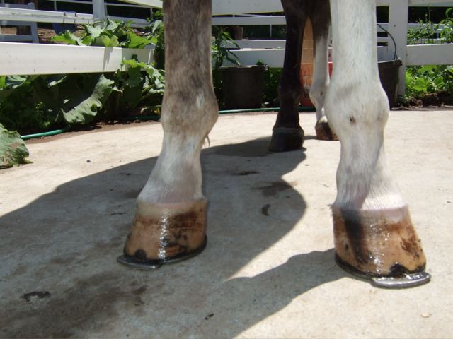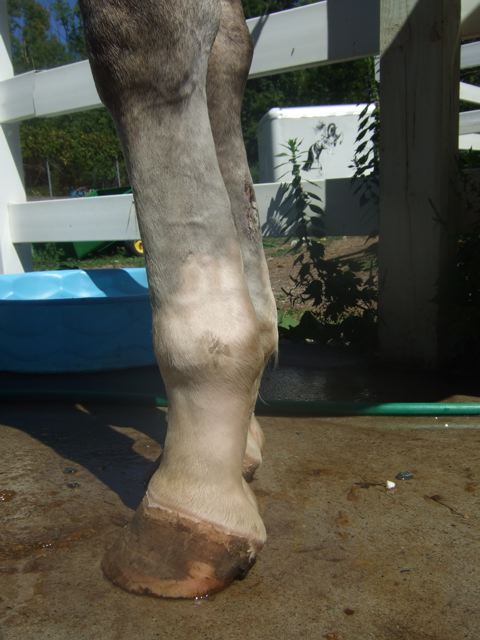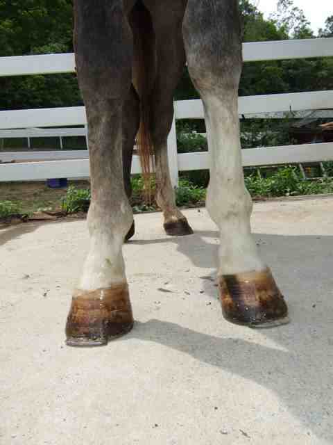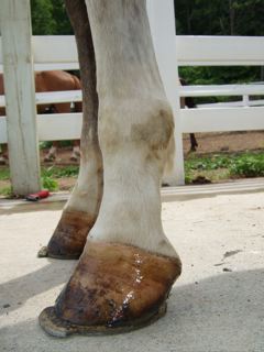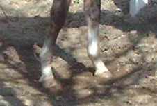 Posted on Tuesday, Jan 1, 2008 - 4:06 pm: One bad thing I have noticed since being on this diet change is he has started to eat his manure. He is out by himself and is getting more hay than previous... I dont know if it is because he is a colt or because of the oats or due to some of the other reasons I read about on this board. Anyway, here are some pics from my cell phone. Although they do not look normal, they are much improved from a few weeks ago when he was back to knuckling on the left which he is not doing at all anymore, and it is the first time in a long time that he has not knuckled with his toe extensions off. I dont want to get to complicated, but in all my perusing about this I saw where some felt natural balance shoes would help, opinions?:Left Right