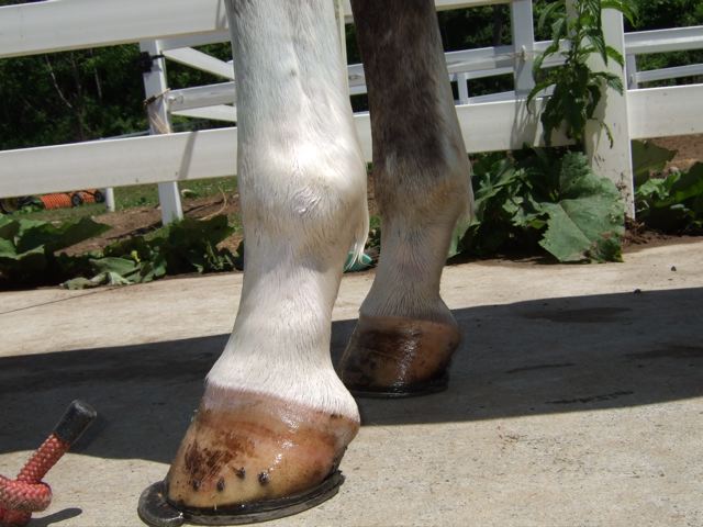 Posted on Friday, Jul 6, 2007 - 8:33 am: Hi Dr.O,The two Pics right above your post are taken 2 1/2 weeks apart. The one on the left is the older picture. So I am clear you think his angle is getting more upright? I guess I can see that in the pictures. Could that be because it is time to reset the shoes? (which it is). He is eating very little, we dont have calf manna around here so he is getting the purina strategy, 2 cups (16 oz dry measure) twice a day and about 2 flakes twice a day. Zoe |