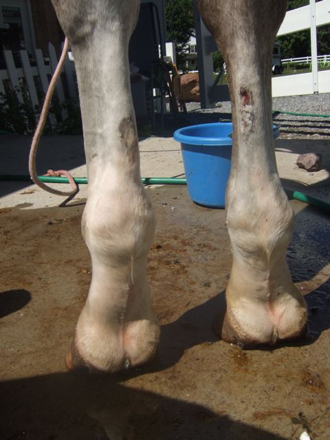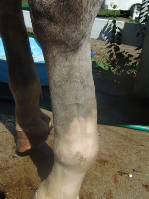 Posted on Monday, Aug 27, 2007 - 2:29 pm: Dr.OI dont know If I should post this question here or start a new thread. But I will try it here. Fahrens Kuring was on 8/16. That morning he was braided then left in his stall in an empty barn where he was quite agitated, after a bit they moved him down to the barn with the other horses. He had for the past few night been being wrapped at night with polos in front to keep him supported and make sure he did not get back into the habit of knuckling over at the fetlock since hid shoes were off. When I got to the barn and took him out to touch up the yellow spots with a bath and took his wraps off I saw that his left front leg on the front looked like someone had wrapped a rope around his leg under the skin and his tendon was very swollen above the fetlock joint. I asked the folks that had been there what could have happened and they were not sure, but said after seeing his legs they thought he tried to jump out of the stall (1/2 door) did not make it and raked the front and back of his leg along the top of the door (his chest was also swollen on one side). He was off at the trot, not head bobbing, but uncomfortable. I cold hosed him and put an ice boot on, the Judges let us show him to them in polos for support. After the Kuering I brought him home a short distance and took of the polos and the swelling was almost gone, none on the front of the leg and while the tendon was still a little thick and warm was not bowed out as it had been. I read your article and kept him on stall rest wrapped in no-bows and track bandages with one gram of bute twice a day and ice boot therapy and cold hosing. When the wraps were first removed the tendon would look great, but after hosing or the ice boot the swelling would have significantly increased. After a weak I started hand walking him for 15 minutes/day after cold hosing I also stopped the treatment with bute. Every time I take his wraps off the tendon looks good, meaty but good, but swells without the pressure (the front of the leg swelling has not returned. He is happy and fine on stall rest and I am hand walking because your article suggested it. Our plans had been to try a dyna splint https://www.dynasplint.com/veterinary_equine.html But I dont know how long after this injury we should wait? Before they fit them with the splint they suggest x-rays of the coffin to see if there is any tipping. We have a vet coming do take those films on friday and at that time I will get there opinion on his tendon as well. We also did not put the toe extensions back on yet because of his tendon injury I did not know if it would be a good idea? (On a side note the toe extensions seemed to be making him move a bit funny, like he was worried about tripping so he was almost winging, even when the shoes were off). Below are pictures of his tendon after cold hosing and drying (wraps off about an hour, maybe a bit more) We think the injuries on the back of his leg are from trying to get over the stall)