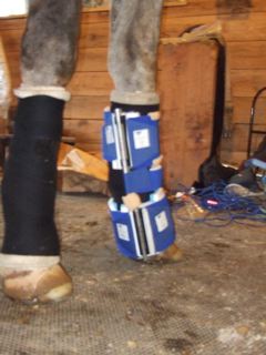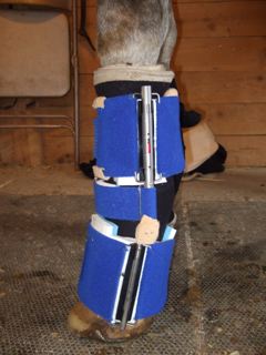 Posted on Tuesday, Sep 11, 2007 - 5:46 pm: UPDATE: Our Dynasplint arrived today. I have adjusted it and put it on. I will keep everyone updated on the progress. I am a bit concerned about the cuts on the back of his leg being able to heal properly since they are wrapped all of the time for his tendon injury (they also like them wrapped under the splint). The skin that you can see in the pictures over the cuts has sloughed off. I have now been applying neosporin and a cotton bandage under his standing wraps... Any suggestions? I have read the article on wound care, but this is tough with the wrap and pressure...Thanks Zoe ![]() ![]()