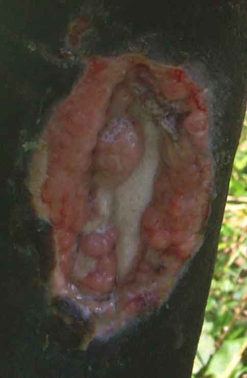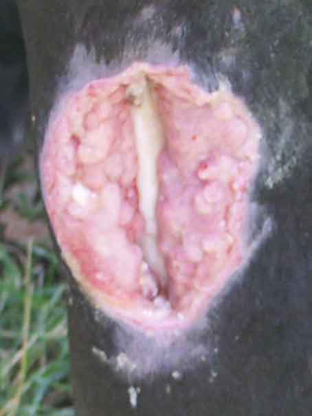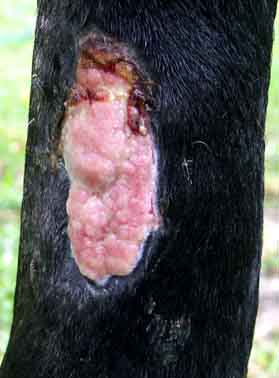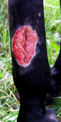 Posted on Sunday, Jul 22, 2007 - 6:12 pm: I think the wounds look very good IlonaA though I would like some images further back to better orient the location of these wounds and see the surrounding swelling. I presume the Amoxi-Mast is a amoxicillin based mastitis medication which would be a fine medication for this. Though with good care it might not be needed I will typically put such wounds on systemic antibiotics until the bone is completely covered with granulation tissue.Your treatment regimen sounds good and I look forward to a pictorial history as this wound heals and I see no reason he will not return to 100% soundness. DrO |