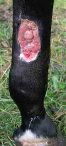 Posted on Wednesday, Jul 25, 2007 - 9:12 am: Dr. O,Here is an update of the injury 5 days later. There is still a copious amount of yellow excretion when I remove the bandages. I have been surprised at how rapidly the bone has been covered over this period of time. Antibiotics were administered systemically for the first 10 days, I failed to note that in my first post. I shall post pictures every 5 days so that progression can be noted. I am thrilled to hear that he will be 100% sound in the future. Should I expect the development of proud flesh? Thank you for your feedback. ![]()