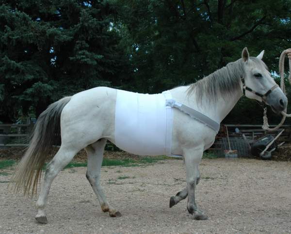 Posted on Saturday, Feb 23, 2008 - 12:32 am: Hi Kathy,Wish I could help you diagnose this problem. Since you don't have access to a lot of help, I wanted to pass along something that I tried with great success for a pony of mine who tore a psoas muscle many years ago. She apparently hyper-extended herself (possibly through a fall or taking a kick-- who knows). She was extremely painful, and I laid her up for 5 months with no improvement. One night, I realized that I needed either to put her down or come up with some approach that would let her heal. For her particular injury, I realized that gravity was the main enemy-- the longer she stood around with her belly DrOpping, the worse the injury became. The solution was Operation Pony Girdle. I ordered a large orthopedic bandage and rigged a breastplate. She wore the horror pictured below for 8 weeks (that was day 1, and she hated it). She healed, and I still have her today. This may help you brainstorm ways to help your mare, if it's NOT neurological and you don't have access to fancy treatment. Good luck.