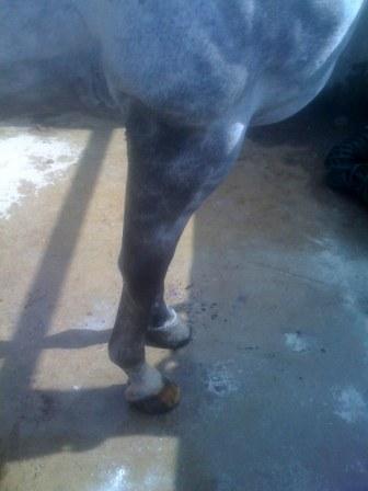 Posted on Saturday, May 9, 2009 - 6:42 pm: When I posted 2/3 lame what I ment was he was between a 2 and 3 on the lameness scale. Yes, 3 days after putting wedge pads he went lame. I rode him on day 1 and 2 he was fine and day 3 was when I noticed something was wrong. I called the old farrier that put the pads on and he took them off and replaced the left front with a bar shoe and a regular shoe on the right front. Two weeks ago the new farrier trimmed and put regular shoes on as you can see with the photos. |