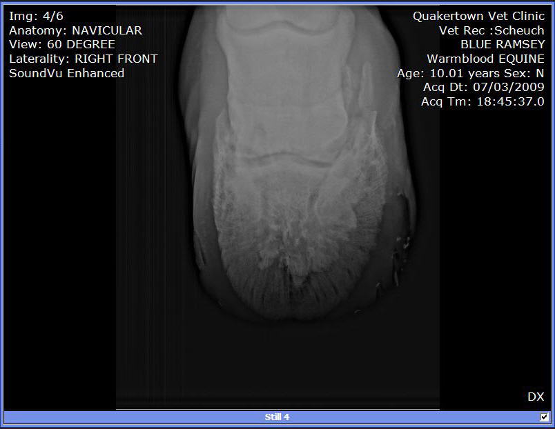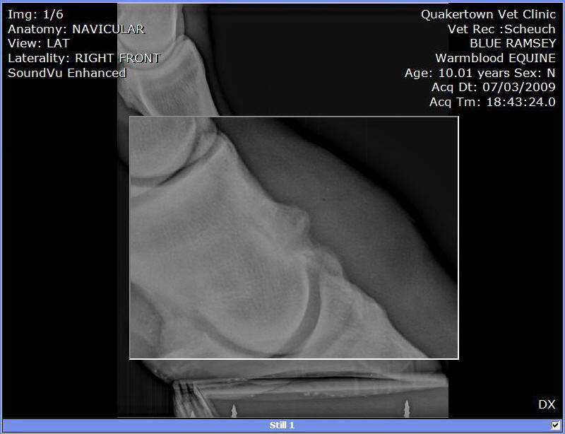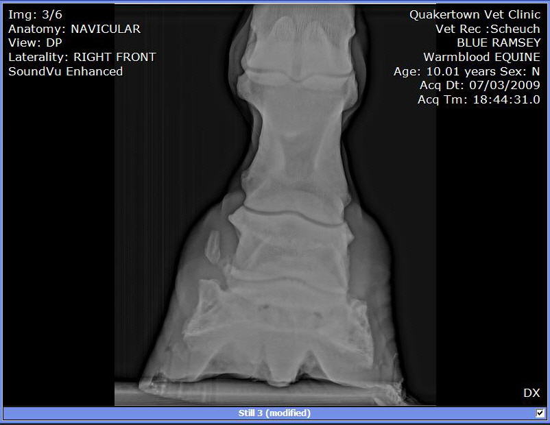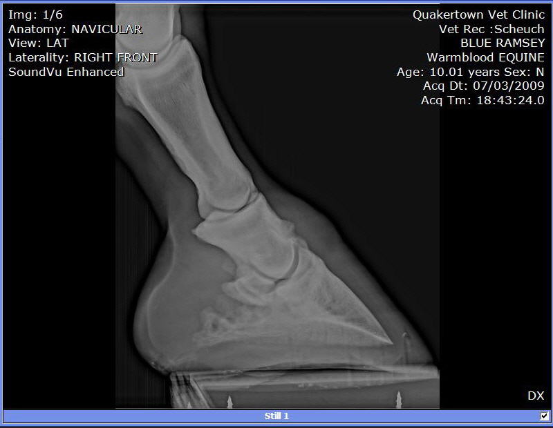 Posted on Saturday, Jul 4, 2009 - 9:29 am: We purchased this guy at auction in Late May 2009. He was headed to slaughter. During his 4 week quarantine, he was moving stiffly but able to walk trot and canter. It looked like he needed sometime off. Maybe a place to retire, but not slaughter. We put shoes on. Last week the farrier replaced them. He used a hoof tester checking of abscess or some reason for his slight limp. Since that day he as barely been able to walk. So, we called in the Vet to have him tested. A block in the heel helped him quite a bit. A block low in front and he was able to walk and trot without a limp. X-rays: |