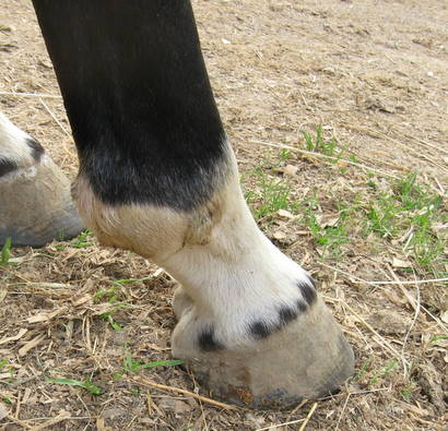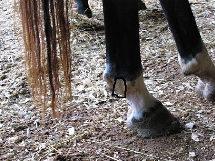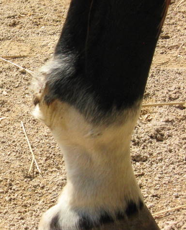 Posted on Monday, Sep 28, 2009 - 3:29 am: Good pics Diane! BTW, what happened to the "thing" (splinter) along the way?In the side view, are there two small holes, like a snake bite mark, in the center where the fetlock ends and the pastern begins, just below the black hair? |