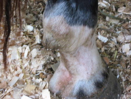Posted on Sunday, Aug 23, 2009 - 11:39 am: I have been reading up on different causes of "red skin" in that area....which leads you everywhere. BUT now I am wondering could this be caused by some sort of dermatitis. I noticed today that Hanks has 3 black looking scabs on the side of his pastern that RESEMBLE scratches...they developed yesterday. I wonder if this is related...he didn't want me picking at them!He had scratches once as a 3 yr. old that got terrible, we were able to get them under control with dermavet and azium rather quickly ... they were located in the more normal area of below the fetlock...these "scabs" are higher up then where "normal" scratches usually appear. We have had a lot of rain and mud, but he has been inside until it dries, because I didn't want him slipping. I can honestly say his leg has been dry and mud free. I have some dermavet here I may put that on his lump and black scabs and see if that helps...Just weird. I wonder if I could talk the vet into coming out on the cheap "for a learning experience" and look at this mess! The new scabs...will try to get better pic tonight