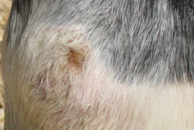 Posted on Tuesday, Sep 8, 2009 - 7:09 am: Hmm.Diane, does the black area feel kind of hard/stiff when you touch it? It looks to me kind of like a type of "scratches" that I've seen where serum oozes out through the skin with tiny ulcerations underneath the black stuff. |