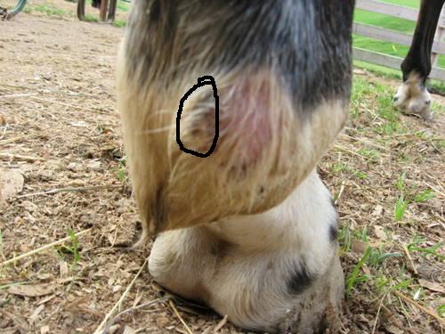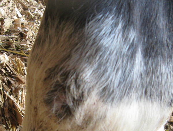 Posted on Sunday, Aug 30, 2009 - 3:52 pm: Interesting photo.I would be inclined to hose and scrub this area vigorously twice daily with liquid Nolvasaan (from Vet's office) added to water to make a nice blue shade, dry and treat any open skin with an antibiotic ointment and then apply diaper rash ointment (Desitin or generic) to protect and soften. But if the open wound area is too moist I would dry it with blue lotion after scrubbing instead. As for the swelling, I would massage the surrounding area with Witch Hazel twice daily. "The thing" has got to go! |