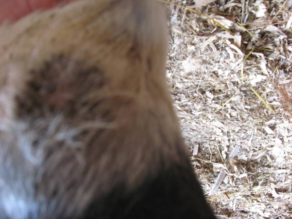 Posted on Monday, Aug 31, 2009 - 3:53 am: DianE, this is unlikely a parasitic disease. The Aug 30th image above represents hair loss and irritated skin, possibly do to a primary dermatitis or secondary to a small focal abscessing cellulitis. The primary dermatitis may either be contact (reacting to something put on there) or infectious.Either case I would consider poulticing with a good quality wide spectrum antibacterial cream or ointment should be helpful. If after a week this still persisted you and your veterinarian could consider adding a topical steroid. DrO |