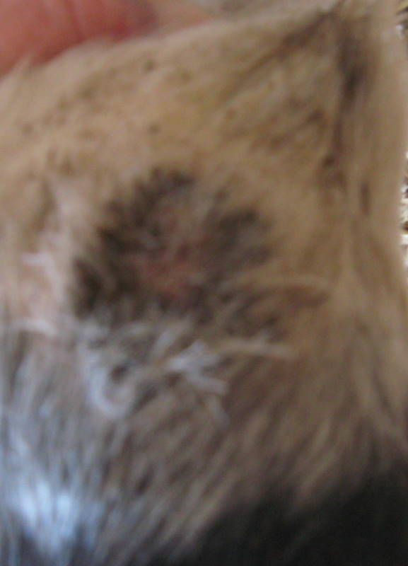 Posted on Tuesday, Sep 8, 2009 - 11:27 am: Vicki in away it does resemble scratches, but it isn't . It is hard and stiff and has become a bit crumbly in the last day or 2. From my post above I mention that he was getting a ring of what appeared to be raised scar tissue around it and it was turning a dark purple (which you can see in my post dated Aug. 31 in the 1st pic) it has just continued to get darker until it is now black! The 2 OOzing spots have remained as you can see in my above post. The "ring of scar tissue" is still there too. Dr. O. I don't think I want to chance shaving this by myself...he was fine for the vet while I was holding him, but I don't know what his reaction might be for sure and that is a precarious spot, I also don't have a clippers that could do it I don't think...I will see if I can get better pics of it. Thanks |