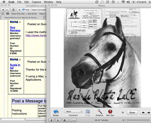 Posted on Sunday, Sep 20, 2009 - 6:15 pm: Suzie, I can't wait to try your suggestion! Ever since I got this imac, I've been photo challenged. I had my old computer down pretty good and have been working on getting to know how to do all the stuff I used to do!Thank you so much. Vickie, sorry we got off track on your thread. I watched the video and it sure looks like a nice horse! Hope it vets out okay for you! erika |
