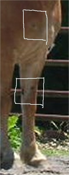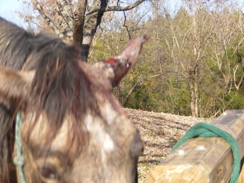 Posted on Monday, Nov 9, 2009 - 8:15 am: I got the cream in the mail with no instructions. I found them online but am a little annoyed that they were not shipped with them. I got more recent pictures of the sarcoids. Candy has only one left on her leg and it is not oozing. Biscuit on the other hand has seen a marked increase in the size and in addition it has broken open and began oozing again. I am not certain whether the friend we had who wanted to ride her broke it open when bridling or if it broke on it's own.The directions do say to remove the old cansema after 24 hours and re-apply but I'm not certain that is practical. Any thoughts? Here are the pictures. Biscuit first since she is the worst. One thing to note the size increase and the bloody appearance is a recent event. Also, we have had very warm days here - 60's so the flies are out in numbers. They look disgusting I know. We are not going to treat the flat one on the side of her face at this time. The amount of cream is very small and we want to have enough to do both horses if possible. We will order more if it works on these two. Wish us luck! And now Candy: