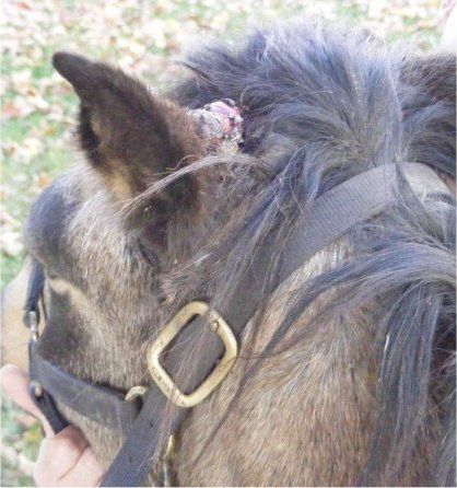 Posted on Wednesday, May 5, 2010 - 6:32 pm: I wanted to update my thread. We have still not tried the cansema on the haflinger mare. She actually ripped the one on her leg completely off! But she is getting the spots back that she had last year. They stayed hairless and are small. We may try the Cansema, we have not decided yet.Biscuit has responded very well to the Cryo therapy. Her sarcoid on the ear was frozen off twice now and our vet says it may need to be done another time or two but it looks to be healing and making scar tissue. Here's a recent picture from a trail ride from April 18th this year. We have not done anything about the plaque on the side of her face. I'm unsure of the best way to treat it. It's mostly flat with some small upraised nodules. I don't really want to use the acid type treatment. Any suggestions? Would cryo be as effective or doable with a more flat lesion? ,