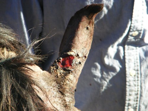 Posted on Monday, Nov 16, 2009 - 9:13 pm: Biscuit had her sarcoid frozen off today. It had developed a foul odor and I was worried about infection. The vet said it was the scab and parts that had fallen and stuck around it that were causing the smell. It took the better part of 3 hours on and off to get it all frozen off. He sent part of the mass off to be sure it is not malignant. He said we'd probably have to repeat in 4 to 6 weeks. There was also apparently a smaller one nearby that he also froze off. Keep your fingers crossed and thanks again everyone for sharing your experiences and for the advice!! Here are the after pictures. She is on stall rest for a few days but hopefully will be fine. I really hope this will wipe it out for good!