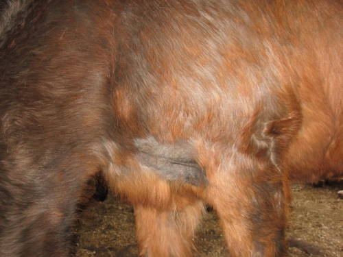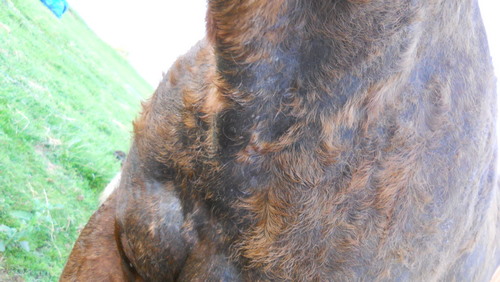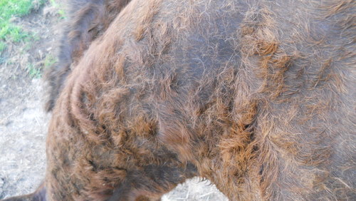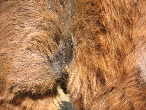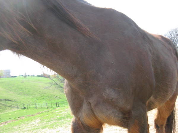 Posted on Tuesday, Apr 13, 2010 - 5:28 pm: Here is a pic of Sam's Shiny burgundy coat, while he isn't all the way shed out, he is going to be, what is left I can easily pull out.. I had forgotten what a pretty color he was, his Cushings coat is a drab orange color as you can see.This is a weird observation I made when Sam was sick, his neck hairs felt really gooey, almost like there was serum or blood stuck to it under his neck..very hard to brush out. As time went on his whole coat got like that, it was the oddest thing. I thought maybe he had gotten into tree sap or something...that's how gooey it was. Of course there are no trees in my pasture. I think it had something to do with his shedding. I don't think that is what made him shed per se.. I think it was his coat changing. His neck was what shed first. I did comment on his "serumy" neck in his "sick thread". I then decided maybe it was what Dr.O's article meant by a greasy coat, but it didn't feel greasy it felt gooey, like when you get blood in your hair and it dries. Sam has never had a "greasy" coat. Just strange(of course) has anyone else experienced that???? Pretty summer coat (I hope) Still bald under his neck...even tho that was the first to shed