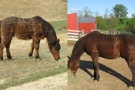 Posted on Monday, May 3, 2010 - 7:13 pm: The changes in Sam are quite amazing I have been meaning to post a pic of my shiny Sam, he even has dapples He still has a little hair on his butt and legs to shed, but it is coming out. First pic is last year the end of April, that is all he shed.. the hair under the long orangeish hair is very thick and lont too. His stance is much more comfortable (tho his hooves are still a mess) and he is gaining some muscle tone. Pergolide has worked remarkably well for him.