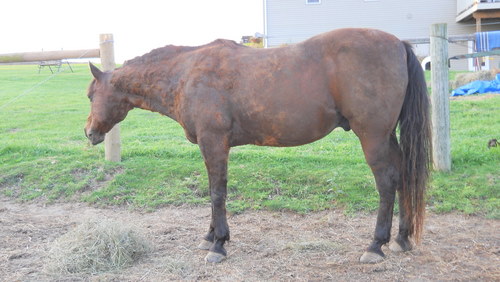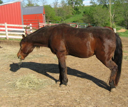 Posted on Thursday, Apr 8, 2010 - 9:05 pm: I believe Sam is going to "bald" all the way out from the looks of it. Tonight I noticed where he went bald first there is some hair growing.. quite amazingly I have forgot what color his summer coat is, he hasn't had one for so long. I was talking to my friend who is in the hospital and asked her if she remembered (she always loved Sam). She said he was kind of a burgundy color... she nailed what color is coming in!Sam is also loosing his fat pads. He looks really good (even tho he is bald in spots) he went galloping up the hill with Hank today tails flagging... stopped and did the trumpet sound... and took of galloping again.... love it Hard to believe he was at deaths door not long ago!! The pergolide is doing wonders for him even at the small dose of .75mg's |